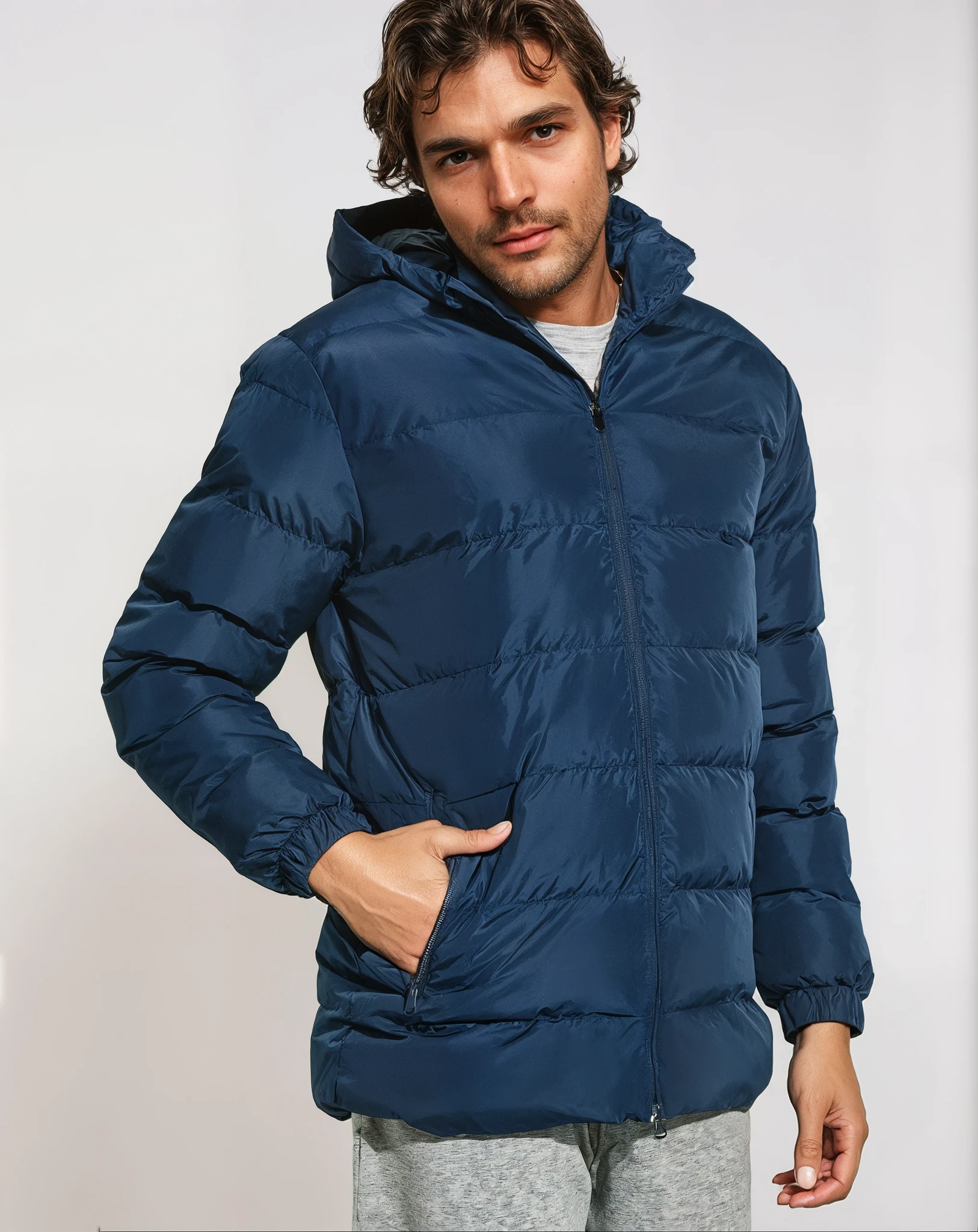 Giacca sportiva imbottito. Cappuccio rimovibile nel colletto con zip iniettata. Cerniera anteriore completa iniettata con tiretto e mentoniera. Polsini elasticizzati. Due tasche esterne con patta. Tasca interna per il portafoglio con velcro. Tasca interna con patta per il cellulare.