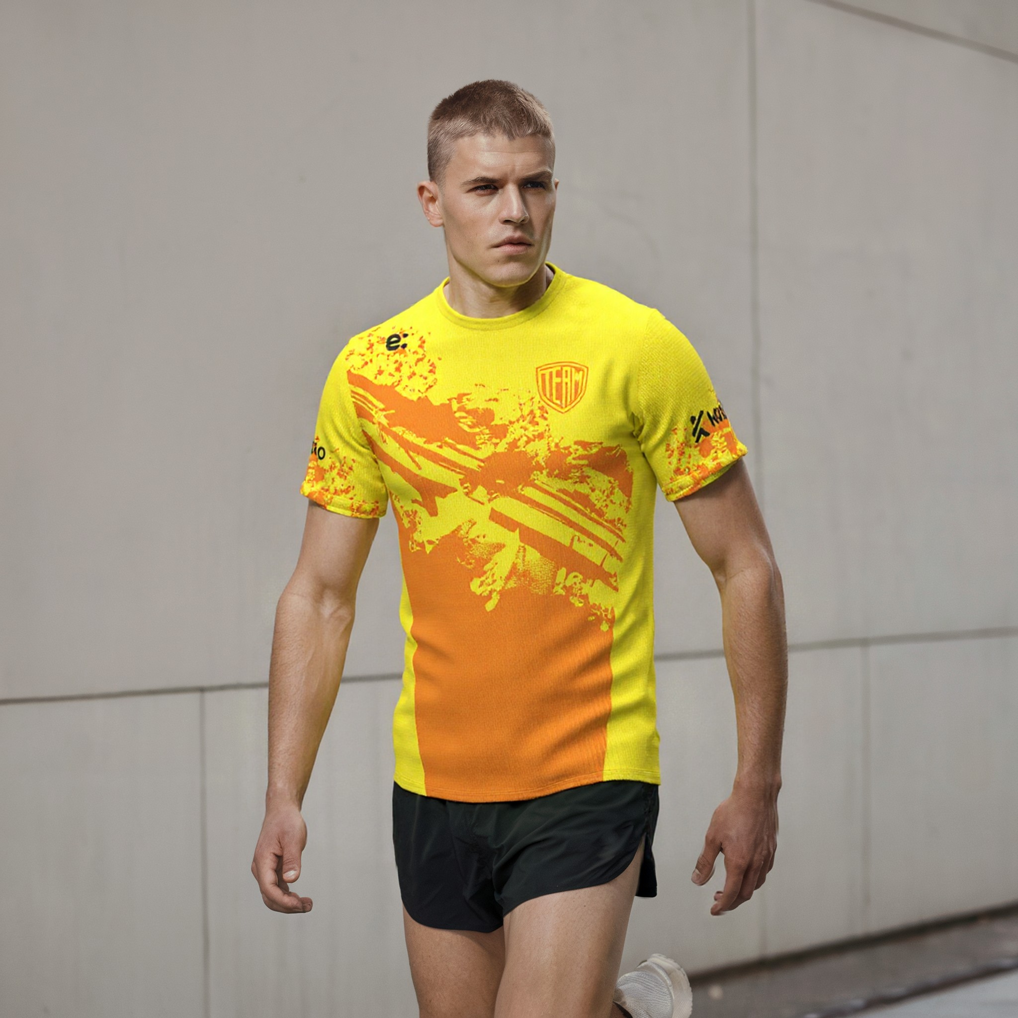 Maglia running professionale unisex in sublimazione. Cuciture piatte. Asciugatura rapida.